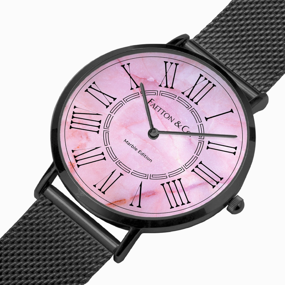 O mostrador elegante deste relógio remete à beleza grandiosa do raro mármore com veios rosas. Seus números romanos adicionam um toque de sofisticação, enquanto o círculo grego jônico no centro da peça cria uma composição luxuosa e atemporal.