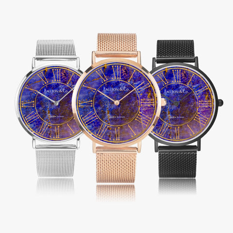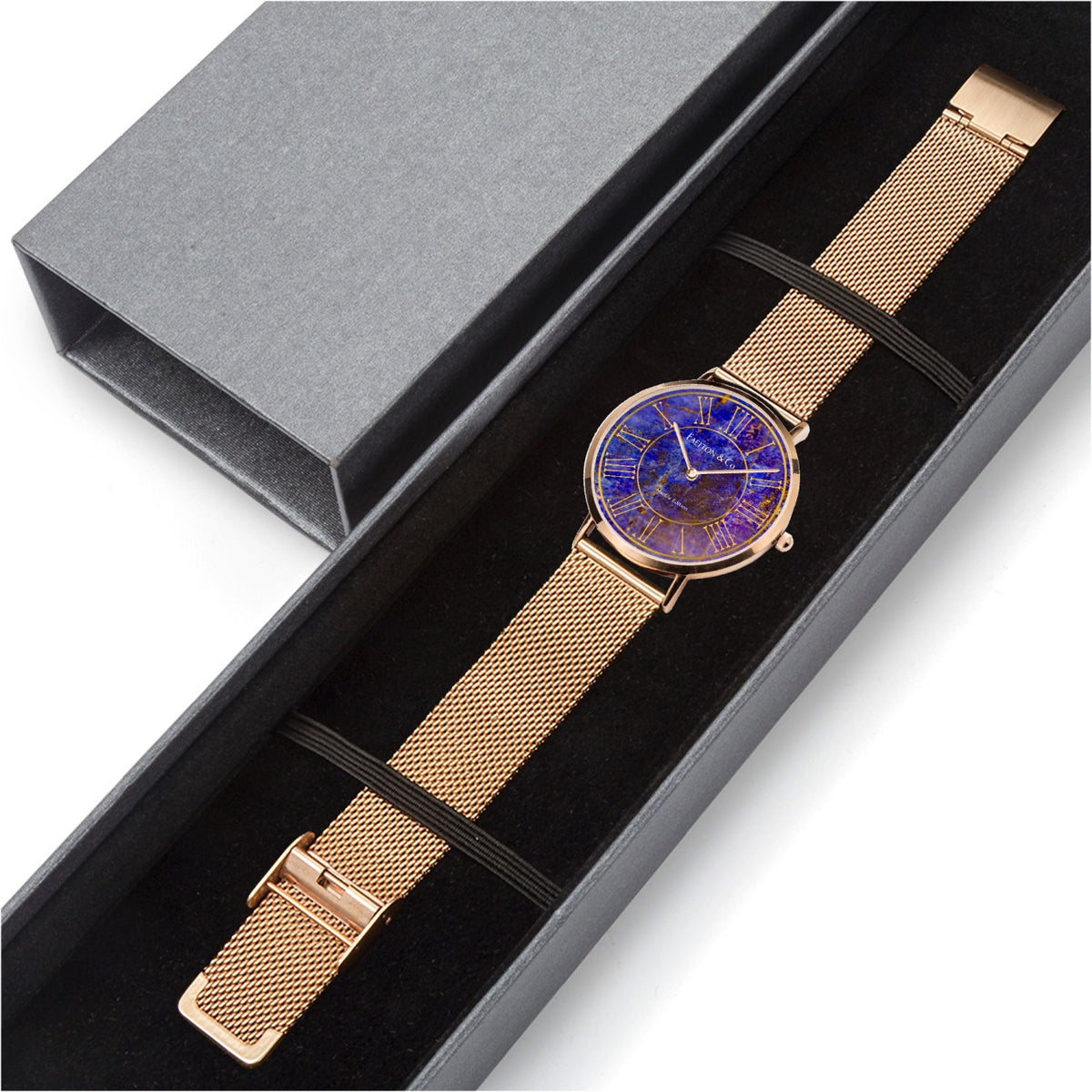 O mostrador sofisticado deste relógio remete à beleza grandiosa do raro mármore com veios roxos. Seus números romanos adicionam um toque de seriedade e elegância, formando uma combinação perfeita para um design luxuoso e atemporal.